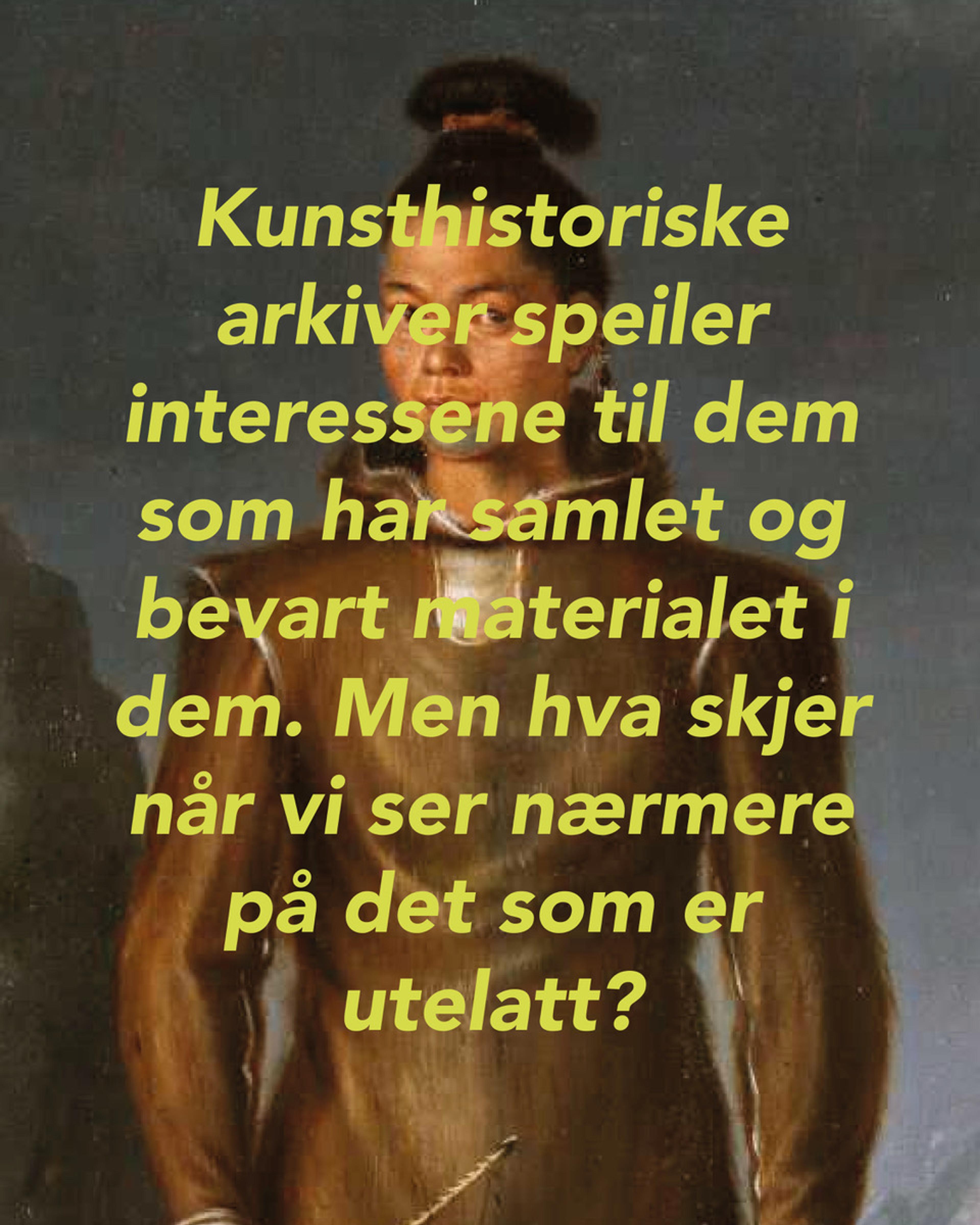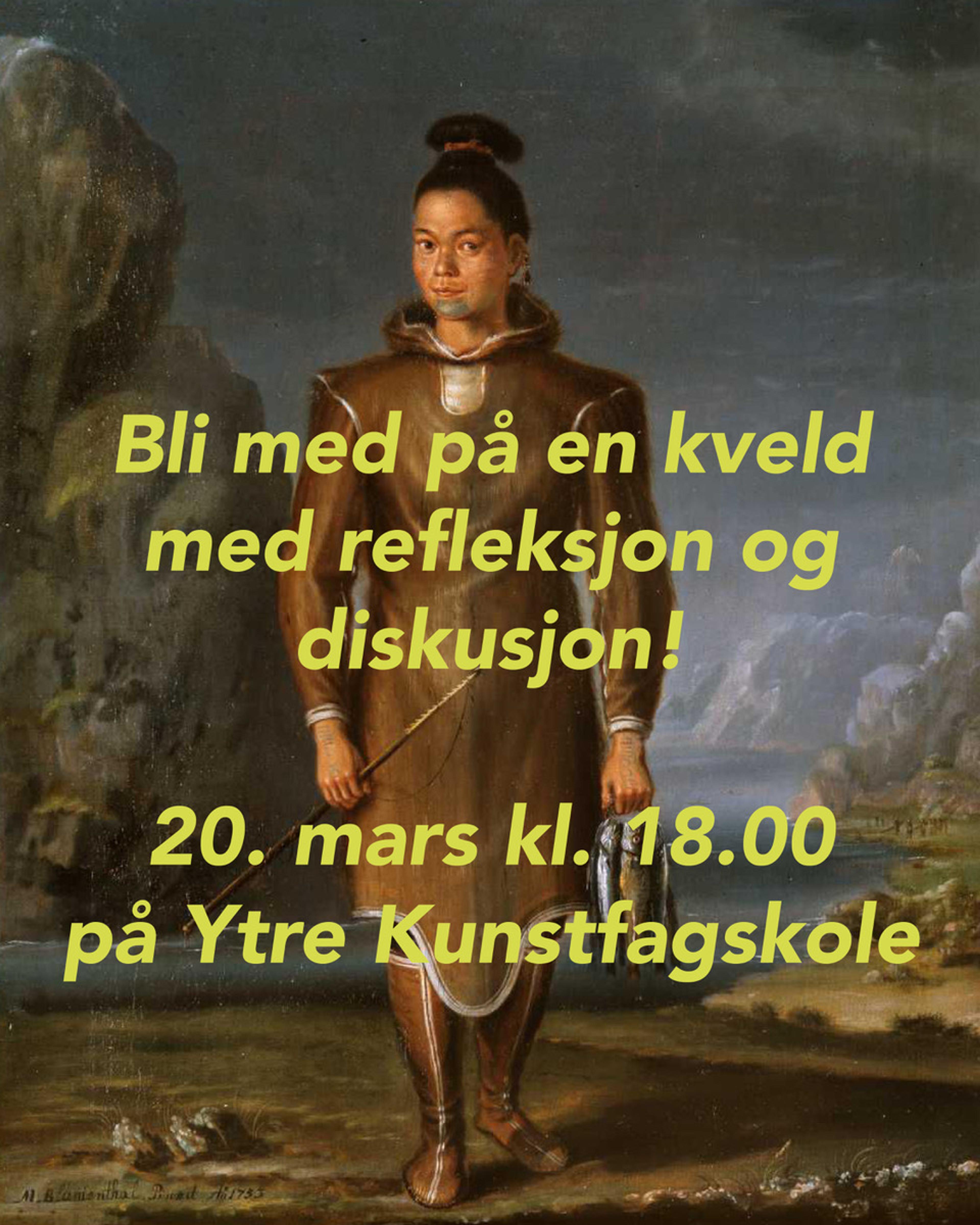 Den 20. mars inviterer Ytre kunstfagskole til foredrag med kunsthistoriker og UiB stipendiat, Tuva Mossin. Hun forsker på Norges koloniale forbindelser til Grønland og stiller spørsmål ved hvordan kunsthistorisk forskning og kuratorisk praksis kan utfordre etablerte narrativer, med et særlig fokus på den ukjente historien om inuitten Maria Epeyubs datter, som kom til Bergen i 1747 og ble foreviget av maleren Mathias Blumenthal (1719–1763).